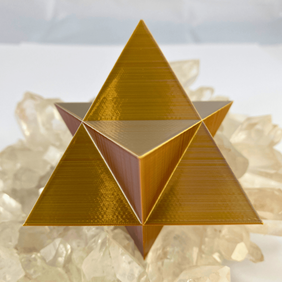 Figura de geometría sagrada que se obtiene por la unión de dos tetraedros. Impresión 3D con PLA. La Estrella Tetraédrica o también llamada Merkaba, remite a un vehículo de Luz. Trabajar con esta Geometría nos aporta la apertura de caminos.