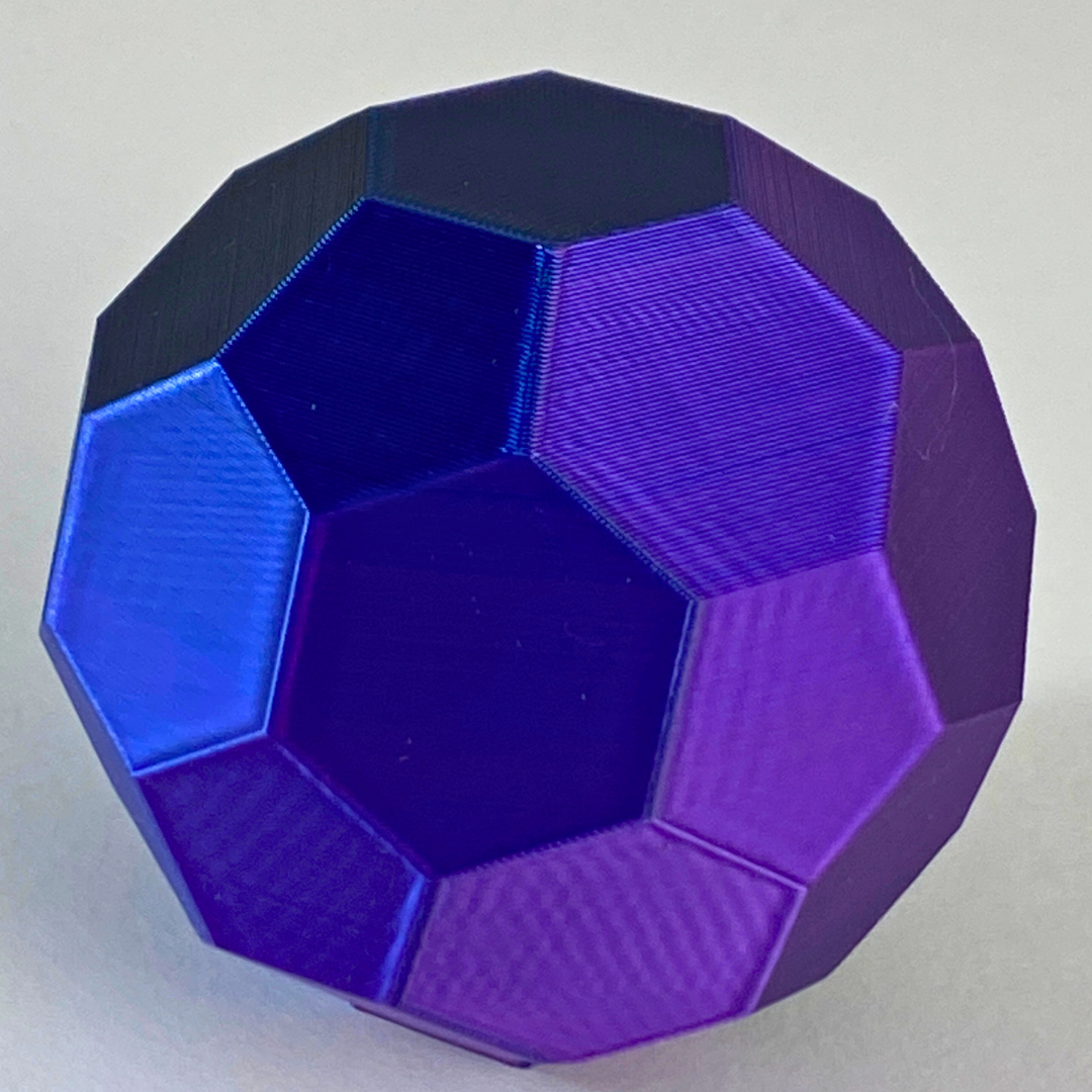 Figura perteneciente a los sólidos arquimedianos. Impresión 3D con PLA. El Icosaedro Truncado está relacionado con el elemento Agua. Esta Geometría tiene muchas aplicaciones entre ellas, nos ayuda a trabajar la comunicación.